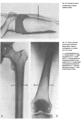 Прямые снимки, выполненный при сгибании колена на 30° - укладка Шусса или на 45° - укладка Фика (рис.2), производятся для оценки состояния задних отделов суставной щели, на уровне которой чаще всего и обнаруживаются повреждения субхондральных отделов костей (остеонекрозы) и хрящевых структур (остеохондриты).