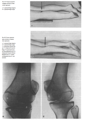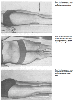 Пучок рентгеновского излучения направляют отвесно на центр подколенной ямки (рис. 414). Снимки коленного сустава в прямой проекции при сгибательной контрактуре могут быть выполнены и при других вариантах укладки (см. рис. 414, а, б, в).