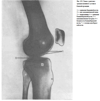Рентгеновская суставная щель коленного сустава выявляется между мыщелками бедренной и большеберцовой костей (рис. 418).