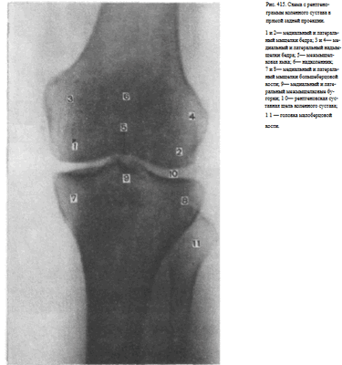 которыми определяются медиальный и латеральный межмыщелковые бугорки. На латеральный отдел метаэпифиза большеберцовой кости частично накладывается головка малоберцовой кости. Между мыщелками бедренной и большеберцовой костей выявляется рентгеновская суставная щель коленного сустава в виде неравномерно изогнутой полосы просветления (рис. 415).