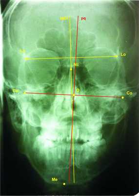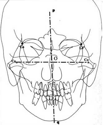 Графические модели, созданные нами по ТРГ черепа в прямой проекции, обеспечивают возможность высокоточной диагностики трансверсальных отклонений НЧ, так позволяют определить асимметрию НЧ, ротацию, трансляцию в суставах и их взаимосвязь. Асимметрия НЧ по данным графических моделей наблюдается при несовпадении точки Mе с осью симметрии НЧ pq, что может возникнуть в результате: