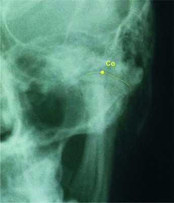 Для определения контура суставной головки необходимо знать анатомические околосуставные структуры. Контур суставной головки не очень отчетлив на ТРГ черепа в прямой проекции, и для большей точности мы рекомендуем данный участок дигитального рентгеновского снимка увеличивать с помощью компьютера [9] (рис. 4, см. на цв. вклейке). Рисунок 4. Увеличение контура суставной головки с помощью компьютерной обработки изображения.