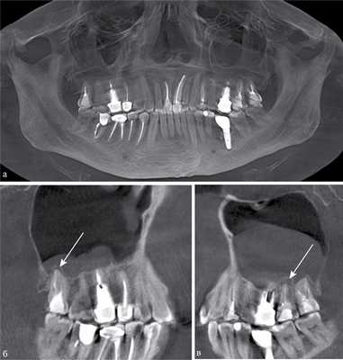 Ведущая роль в диагностике ОВЧС по-прежнему остается за лучевыми методами исследования. Традиционно для оценки околоносовых синусов, в том числе верхнечелюстных, применяется рентгенография в носо-подбородочной проекции, обзорные рентгенограммы черепа в прямой и боковых проекциях. Для визуализации зубов используются ортопантомография или внутриротовая контактная рентгенография, которые не позволяют достоверно оценить состояние верхнечелюстных синусов [11—14]. С внедрением современных высокотехнологичных методов лучевой диагностики — мультиспиральной компьютерной томографии (МСКТ), конусно-лучевой компьютерной томографии (КЛКТ), магнитно-резонансной томографии (МРТ) — многие врачи стали отказываться от классических рентгенологических методик ввиду их малой информативности [12—14]. При этом в протоколы описания околоносовых синусов не всегда включаются данные о состоянии альвеолярного отростка, зубов верхней челюсти [11, 13]. Это может привести к несвоевременной диагностике и различным местным и общим осложнениям у таких пациентов [15, 16].