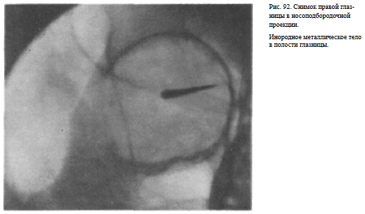 С целью определения возможных артефактов на рентгенографической пленке, которые могут симулировать инородные тела глаза, снимки производят одновременно на двух, сложенных вместе пленках. Противопоказаниями к выполнению бесскелетных снимков глаза являются свежие прободные ранения рговицы и склеры.
