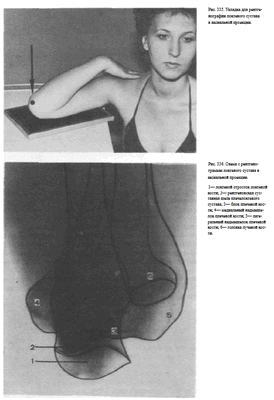 Кассета размером 18X24 см размещена на столе, область локтевого сустава примыкает к ней внутренней поверхностью. Пучок рентгеновского излучения направлен отвесно на суставную щель в центр кассеты (рис. 333),