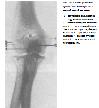 Информативность снимка. На рентгенограмме выявляются дистальный конец плечевой кости, ее суставная поверхность, образованная головкой и блоком, рентгеновские суставные щели плечелучевого, плечелоктевого и проксимального лучелоктевого суставов, головка лучевой кости, локтевой и венечный отростки локтевой кости и проксимальные отделы диафизов лучевой и локтевой костей (рис. 332).