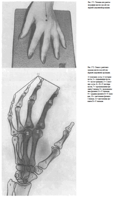 Укладка больного для выполнения снимка. Кисть прилежит к кассете ульнарным краем и отклонена вперед таким образом, что плоскость ладони образует с плоскостью стола угол в 45°. Пальцы слегка согнуты и веерообразно раздвинуты, концы пальцев прилежат к кассете. Пучок рентгеновского излучения направляют на проекцию головки 111 пястной кости (рис.371).