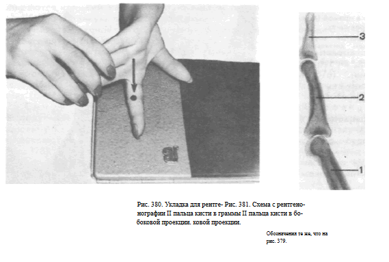На рентгенограмме видны фаланги пальцев, их тыльная и ладонная поверхности, бугристость дистальной фаланги, рентгеновские суставные щели межфаланговых суставов (рис.381).