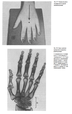 Пучок рентгеновского излучения направлен отвесно на головку III пястной кости (рис. 367).