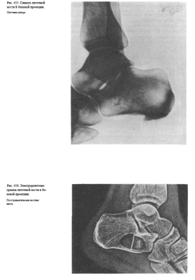При боковой проекции больного кладут на бок больной стороной вниз, здоровую ногу ему нужно вытянуть, а пораженную, немного согнув в колене, положить на функциональную поверхность стола. Тыльно-подошвенная проекция проводится также в лежачем положении. Пациент находится на спине, ноги выпрямлены, стопа согнута под углом 90 градусов. Чтобы ступня не опускалась, ее фиксируют специальными ремешками.