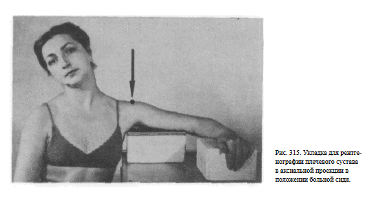 Укладка больного для выполнения снимка. Предложено два варианта укладки: 1. Больной сидит у края стола. Рука отведена в сторону по возможности до горизонтальной плоскости, согнута в локтевом суставе, находится в положении пронации (кисть обращена вниз) и уложена либо на стол, либо на подставки (рис.315). Кассета размером 18X24 см расположена в плоскости стола под плечевым суставом, больной прилегает к ней областью подмышечной впадины. Пучок рентгеновского излучения направлен отвесно на проекцию акромиально-ключичного сустава перпендикулярно к кассете.