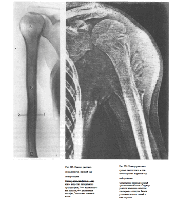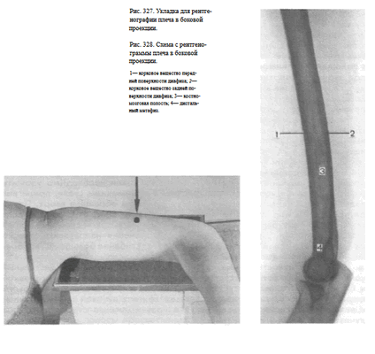 Информативность снимка. На боковой рентгенограмме плечевой кости определяются передняя и задняя поверхности диафиза плеча, четко видны корковое вещество и мозговая полость (рис. 328).