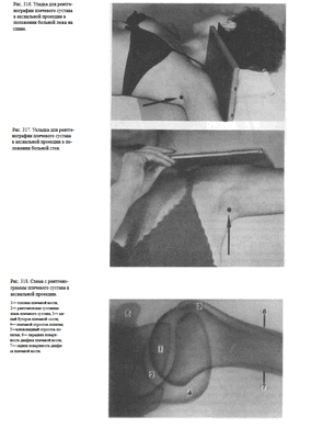 Укладка больного для выполнения снимка. Предложено два варианта укладки: 1. Больной сидит у края стола. Рука отведена в сторону по возможности до горизонтальной плоскости, согнута в локтевом суставе, находится в положении пронации (кисть обращена вниз) и уложена либо на стол, либо на подставки (рис.315). Кассета размером 18X24 см расположена в плоскости стола под плечевым суставом, больной прилегает к ней областью подмышечной впадины. Пучок рентгеновского излучения направлен отвесно на проекцию акромиально-ключичного сустава перпендикулярно к кассете.