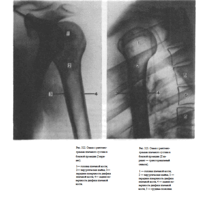Информативность снимков. На снимках отображены головка, хирургическая шейка и тело плечевой кости в боковой проекции (рис. 322, 323)