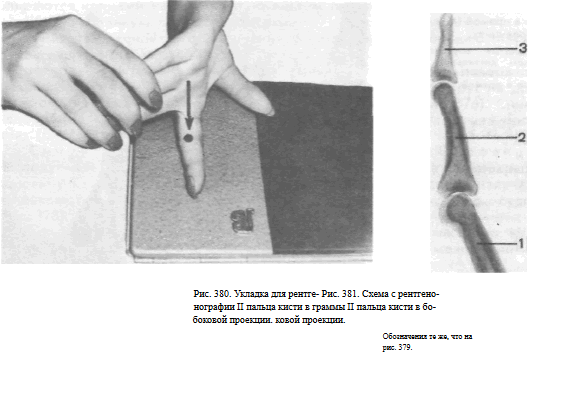 На рентгенограмме видны фаланги пальцев, их тыльная и ладонная поверхности, бугристость дистальной фаланги, рентгеновские суставные щели межфаланговых суставов (рис.381)