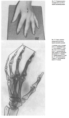 На рентгенограмме видны фаланги и может быть частично видна I пястная кость, их медиальные и латеральные края, щели межфаланговых суставов (рис. 379).