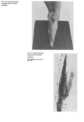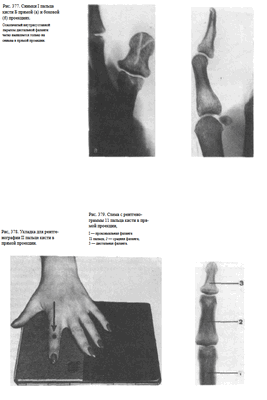На рентгенограмме выявляются тыльная и ладонная поверхности фаланг и частично I пястной кости. Видны наслаивающиеся друг на друга сесамовидные кости рядом с головкой I пястной кости (рис. 376). Снимки необходимо выполнять в двух взаимно перпендикулярных проекциях (рис. 377, а, б).