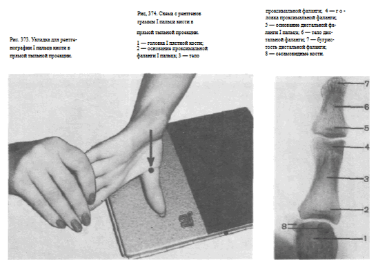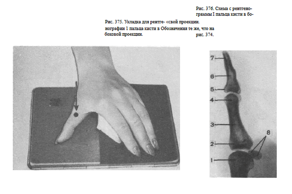 На рентгенограмме видны фаланги и частично I пястная кость, их медиальные и латеральные поверхности, рентгеновские суставные щели пястно-фалангового и межфалангового суставов, бугристость дистальной фаланги (рис. 374).