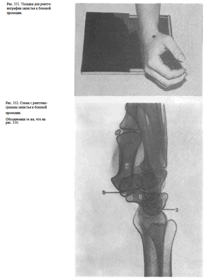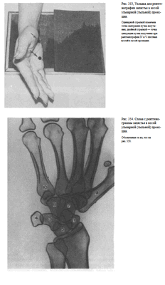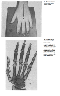 Укладка больного для выполнения снимка. Кисть прилежит к кассете ульнарным краем и отклонена вперед таким образом, что плоскость ладони образует с плоскостью стола угол в 45°. Пальцы слегка согнуты и веерообразно раздвинуты, концы пальцев прилежат к кассете. Пучок рентгеновского излучения направляют на проекцию головки 111 пястной кости (рис.371).