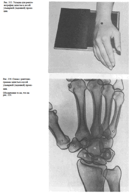 Снимок передней поверхности костей запястья (канала запястья) осуществляют следующим образом: предплечье передней поверхностью прилежит к поверхности стола. Область лучезапястного сустава соответствует средней линии кассеты. Кисть максимально отогнута кзади так, что плоскость ладони находится под углом 90° к плоскости кассеты. Пучок рентгеновского излучения направляют под углом 45° к плоскости ладони, центрируя на проекцию межзапястного сустава (рис. 365, 366).