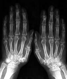 Наиболее информативным и обязательным практически при всех проявлениях суставного синдрома является проведение рентгенологического обследования мелких суставов кистей и стоп, поэтому хотелось бы остановиться на патогномоничных изменениях, характерных для того иного проявления артрита, происходящих именно в кистях или стопах.