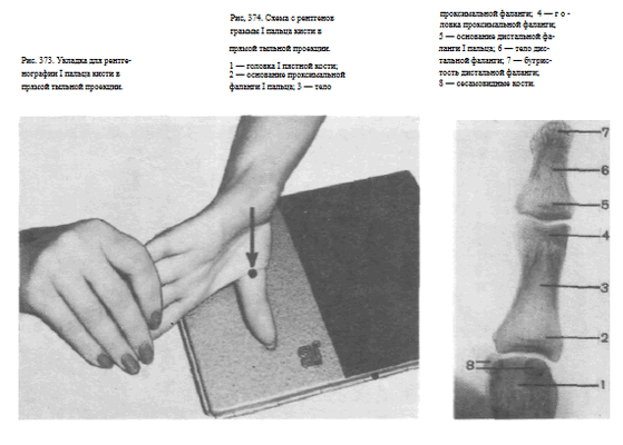 На рентгенограмме видны фаланги и частично I пястная кость, их медиальные и латеральные поверхности, рентгеновские суставные щели пястно-фалангового и межфалангового суставов, бугристость дистальной фаланги (рис. 374).