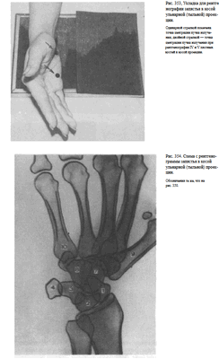 Укладки больного для выполнения снимков. Предложен ряд укладок как для рентгенографии запястья в целом, так и для изучения отдельных костей. К типичным укладкам относят рентгенографию запястья в прямой, боковой проекции, косой ульнарной и косой радиальной проекциях; к специальным — укладки для рентгенографии ладьевидной, трехгранной, гороховидной кости и канала запястья. При съемке можно использовать либо кассеты размером 13Х 18 см для каждого снимка, либо кассеты большего размера (18X24 или 24X30 см), перекрывая поочередно неэкспонируемые участки листами просвинцованной резины.