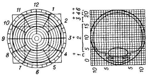 Для этого нужно наложить схему фронтального разреза глаза на фасный снимок так, чтобы вертикальный и горизонтальный диаметр схемы совпали с вертикальной и горизонтальной линиями на снимке, которые сделаны между свинцовыми точками. Затем отсчитывают количество колец схемы от ее центра к тени инородного тела на снимке.