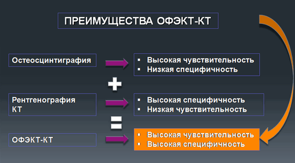 Наибольшее распространение этот метод получил в исследовании костей. ОФЭКТ-КТ исследование объединяет преимущества остеосцинтиграфии - высокую чувствительность и рентгенографии - высокую специфичность.