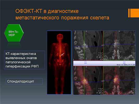 Пример уточняющей диагностики: При КТ-исследовании выявлен очаг, подозрительный на метастазы в 3 поясничном позвонке. После выполнения ОФЭКТ-КТ видно, что это спондилодисцит позвоночника, не онкологическое заболевание.