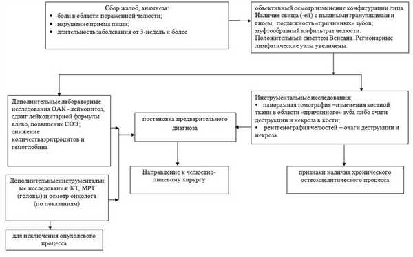 Тактика лечения заключается в удалении сформировавшихся секвестров, иссечении некрозов, свищей, а также резекции остеомиелитического обширного очага.