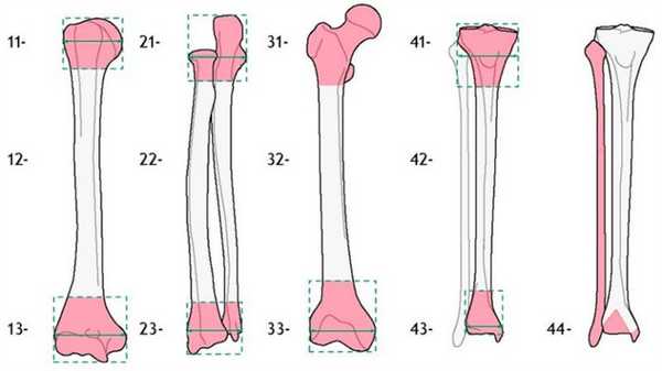 Анатомическая локализация перелома обозначается двумя цифрами: первая для кости, вторая для ее сегмента (локтевая кость и лучевая кости, также как большеберцовая и малоберцовая кости расцениваются как одна кость). Проксимальный и дистальный сегменты длинных костей определяются с помощью квадрата, стороны которого имеют одинаковую длину, как и самой широкой части эпифиза (исключение 31- и 44-).
