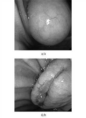 Послеоперационный период протекал без осложнений. Через 6 дней выполнены контрольная дуоденоскопия, эндоскопическая ретроградная холангиография. Медиальная стенка нисходящей части ДПК содержала внутристеночную кисту в спавшемся состоянии размером 2,5×5 см, с продольным разрезом длиной 3 см (см. рис. 3, б). Стенки кисты толщиной 7—10 мм. По контуру кисты, ориентировочно на границе верхней и средней трети его длины, обнаружено устье большого сосочка ДПК, из которого активно поступала желчь. Произведена ретроградная холангиография, контрастирован гепатикохоледох шириной 6—7 мм, из просвета которого контраст частично «сбрасывался» в ранее вскрытую полость кисты и терминальную часть протока ПЖ. Эвакуация контраста в кишку активная по обоим соустьям. При плановом гистологическом исследовании обнаружены частицы слизистой оболочки тонкой кишки с участками мышечной пластинки слизистой оболочки, умеренно выраженной лимфоцитарной инфильтрацией, лейкопедезом и реактивными изменениями покровного эпителия. Патологоанатомическая картина соответствовала ДК ДПК. С учетом доброкачественного характера кисты, наличия широкого соустья между кистозной полостью и просветом ДПК, беспрепятственного оттока желчи и панкреатического секрета принято решение об адекватности проведенного лечения.
