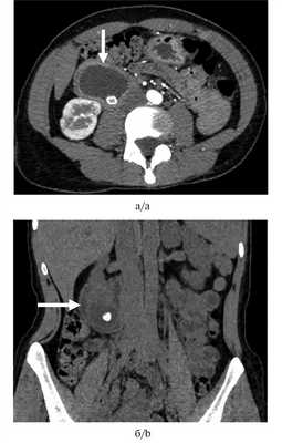 а — аксиальная проекция, артериальный фаза — дупликационная киста двенадцатиперстной кишки с конкрементом в просвете; б — фронтальная проекция, нативная фаза, стрелкой указан суженный просвет двенадцатиперстной кишки.
