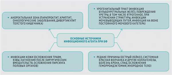 Причины БФ недостаточно изучены, данные литературы несколько противоречивы в связи с различными сроками первичного обращения пациентов и характером некроза. Вероятно, причина БФ — экзогенная или эндогенная инфекция, хотя существует мнение, что болезнь в большинстве случаев носит криптогенный характер. Инфекционный агент проникает в клетчатку наружных половых органов и промежности при условии (1) повреждения защитного барьера кожи мошонки и полового члена и (2) каких‑либо заболеваниях урогенитального тракта или колоректальной зоны.