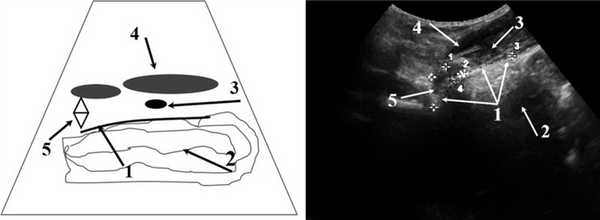 УЗИ эндопротеза выполняли в горизонтальном положении пациента на спине с помощью ультразвукового аппарата Voluson E8 (GE, США), оснащенного датчиком 3,5—5 МГц. Имплантат на всем протяжении сканировали в продольном и поперечном направлениях. Врач ультразвуковой диагностики визуализировал сетчатый имплантат, его положение относительно мышц передней брюшной стенки, лонной кости и внутреннего кольца пахового канала. На УЗИ герниопротез определялся в виде гиперэхогенной полосы различной толщины, располагающейся в проекции пахового промежутка между мышцами передней брюшной стенки и органами брюшной полости на протяжении всего пахового промежутка, перекрывающей внутреннее кольцо пахового канала (рис. 1). Рис. 1. Схема и ультразвуковая сканограмма положения эндопротеза и элементов передней брюшной стенки после правосторонней ТАРР-герниопластики. 1 — эндопротез; 2 — петли кишечника; 3 — внутреннее кольцо пахового канала; 4 — мышцы передней брюшной стенки; 5 — лонная кость.