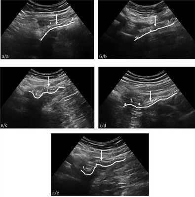 Напротив, среди пациентов, которым выполнена фиксация эндопротеза, в ближайшем послеоперационном периоде протез имеет линейную форму, а с 3-го месяца начинает приобретать синусоидную форму (рис. 3). Рис. 3. Изменение формы фиксированного эндопротеза в течение 12 мес наблюдений (ультразвуковые сканограммы). а — 1 сут; б — 1 мес; в — 3 мес; г — 6 мес; д — 12 мес. Белой линией подчеркнута геометрия эндопротеза. Стрелками указан эндопротез.