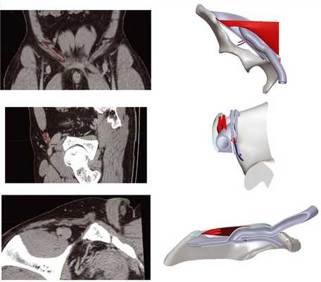 Рис. 13. Сопоставление срезов, выполненных в ПО Vidar DICOM Viewer и созданной параметрической модели пахового канала при различном положении в пространстве.