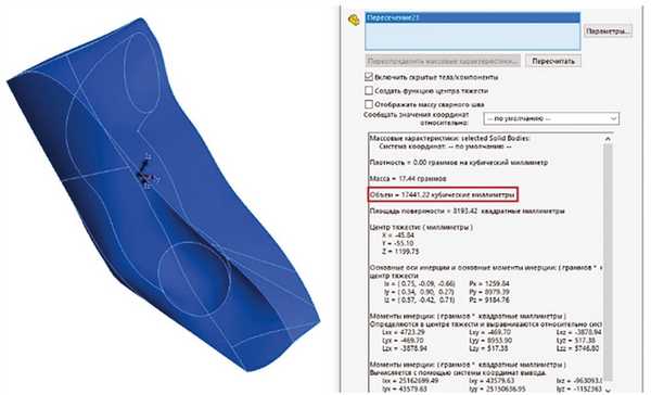 Рис. 15. Индивидуализированная трехмерная реконструкция пахового канала пациента-нормостеника, построенная в ПО SolidWorks на основе данных КТ, и процедура вычисления объема канала.