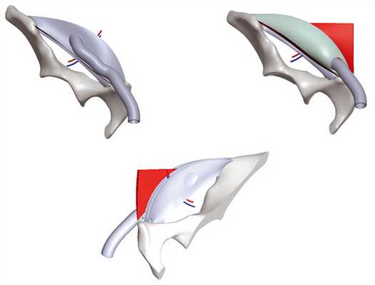 На основании данных, полученных при изучении виртуальных срезов, сделанных с помощью ПО Vidar DICOM Viewer, на основе трехмерных реконструкций в ПО SolidWorks была построена трехмерная параметрическая (статистическая) модель пахового канала, включающая следующие структуры: фрагмент таза, паховая связка, поперечная фасция, переходящая во внутреннюю семенную фасцию семенного канатика, нижние эпигастральные сосуды, нижние края левых внутренней косой и поперечных мышц, апоневроз наружной косой мышцы живота. Выбор вышеуказанных структур был сделан с точки зрения практической целесообразности. С помощью созданной модели был рассчитан объем щелевидного промежутка пахового канала для разных типов телосложения и выполнена разработка основных этапов предложенного оперативного вмешательства (рис. 13, 14).