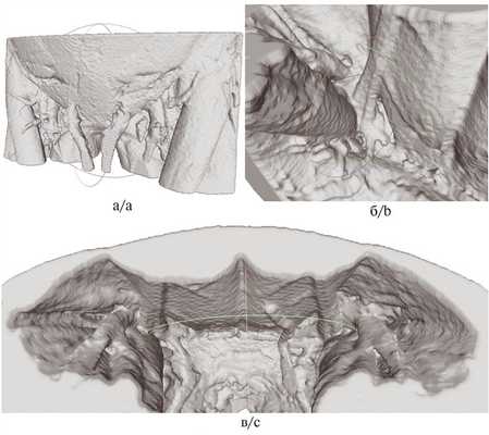 На заключительном этапе работы с данными КТ с применением оригинального алгоритма [12] была выполнена автоматическая сегментация некоторых КТ-исследований в программе Инобитек DICOM-Viewer. Редактирование полученной сетки выполняли в программе MeshLab (рис. 12).