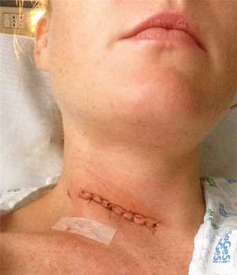 - Хирург аккуратно рассекает по вертикали мягкие ткани с передней стороны шеи. Длина разреза - 3,5-5 см.