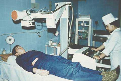 Рис. 5. Исследование больного с помощью передвижного (палатного) диагностического рентгеновского аппарата 12П6.