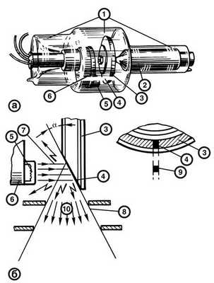 Рис. 8. Рентгенодиагностическая трубка с вращающимся анодом (а — общий вид, б — образование излучения): 1 — колба; 2 — анодная горловина; 3 — вращающийся диск анода; 4 — фокусное пятно анода;5 — спираль накала катода; 6 — фокусирующая система катода; 7 — поток электронов; 8 — поток рентгеновских квантов; 9 — видимый размер фокуса со стороны рабочего пучка; 10 — рабочий пучок излучения; α — угол наклона анода к оси рабочего пучка излучения.