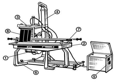 Рис. 3б). Разборный полевой рентгеновский аппарат «РУМ-24». Развернут для обследования больного в горизонтальном положении: 1 — моноблок с рентгеновской трубкой; 2 — опорная стенка поворотного стола-штатива; 3 — экраноснимочное устройство; 4 — колонна с кареткой; 5 — переносный пульт управления; 6 —основание стола-штатива; 7 — носилки; 8 — трехлопастный подэкранный фартук.