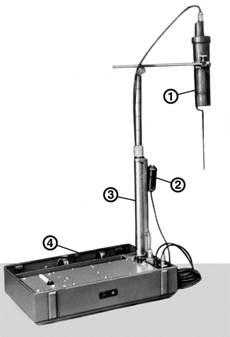 Рис. 6. Импульсный переносной рентгенодиагностический аппарат «Дина-2»: 1 — излучатель; 2 — пульт управления; 3 — штатив; 4 — укладочный ящик.
