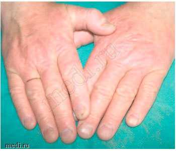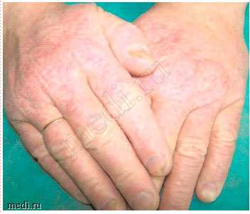 Работает стоматологом-протезистом, контактирует с медикаментами, дезинфицирующими средствами. Давность заболевания 4,5 года, когда впервые после контакта с латексными перчатками на коже тыльной поверхности обеих кистей отметил гиперемию, а спустя некоторое время появление мелких пузырьков, точеных эрозий и мокнутия. Высыпания сопровождались сильным зудом. В медицинском центре был поставлен диагноз: аллергический дерматит и назначены топические стероиды, антигистаминные препараты, инъекции глюконата кальция. Лечение дало временный эффект. Спустя несколько недель после контакта с цементом возникло обострение кожного процесса, но в менее острой форме. Лечился самостоятельно кортикостероидными и антигистаминными препаратами. Обострения возникают каждые 2-4 мес (на ношение перчаток, иногда на дезинфицирующие средства). Настоящее обострение связывает с использованием нового мыла с дезинфицирующим эффектом.