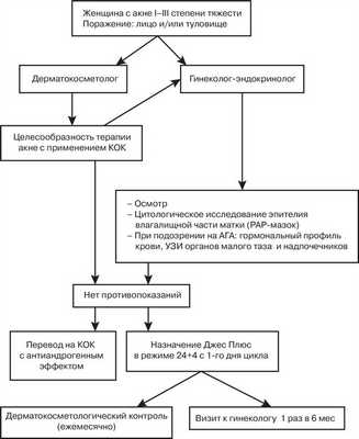 Рекомендовать терапию акне КОК с антиандрогенным действием может и гинеколог-эндокринолог и дерматокосметолог. Динамику кожного поражения в процессе лечения отслеживает дерматокосметолог, а отсутствие противопоказаний для назначения женщине КОК с антиандрогенным действием оценивает гинеколог-эндокринолог. Перед началом терапии, а также по ее окончании необходим гинекологический осмотр, обследование молочных желез и цитологическое исследование эпителия влагалищной части шейки матки для исключения морфологических признаков, характеризующих диспластические процессы (мазок по Папаниколау — PAP-мазок). При подозрении на АГА может потребоваться оценка гормонального профиля крови (ЛГ, ФСГ, эстрадиол, прогестерон, тестостерон, пролактин и ДЭА-сульфат), УЗИ органов малого таза и надпочечников, рентгено/томография черепа (рис. 2). Рисунок 2. Алгоритм взаимодействия специалистов при лечении акне у женщин. Необходимо разъяснить женщине режим приема препарата, особенности контрацепции на протяжении 1-го месяца приема, возможные побочные явления на протяжении первых двух циклов, а также действия пациентки в случае пропуска приема очередной таблетки в зависимости от дня цикла [2].