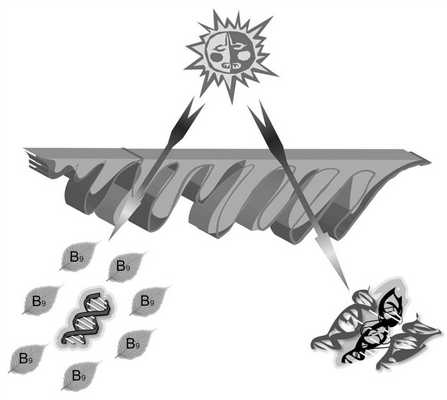 В конце 2012 г. на отечественном фармацевтическом рынке появились модифицированные формы дроспиренонсодержащих КОК — Джес Плюс и Ярина Плюс («Bayer HealthCare Pharmaceuticals», Германия). По сравнению со своими предшественниками в состав каждой таблетки (включая 4 или 7 таблеток плацебо соответственно) помимо этинилэстрадиола (20 или 30 мкг соответственно) и дроспиренона (3 мг) введен левомефолат кальция (Метафолин [*] ) в дозе 451 мкг — стабильная и метаболитически активная кальциевая соль фолиевой кислоты (витамин В9). Фолаты не синтезируются в организме человека. Поступая с пищей, они принимают активное участие в синтезе и репарации ДНК, синоптической передаче и эритропоэзе. Имеются сведения о ключевой роли фолиевой кислоты в процессах репарации ДНК кератиноцитов и фибробластов кожи, в частности, после фотолиза, индуцированного УФ-излучением [11]. Эти данные позволяют рассматривать фолаты как важный компонент в профилактике фотостарения кожи («эндогенный» фотопротектор), особенно учитывая тот факт, что эстрогены повышают чувствительность кожи к УФ-излучению (рис. 1). Рисунок 1. Фолаты (В9) в защите компонентов кожи от УФ-излучения.
