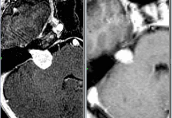 Если предыдущие исследования с большой долей вероятности указывают на шванному, наиболее информативным инструментальным методом визуализации считается МРТ. Это современное высокоточное неинвазивное исследование, которое позволяет определить размер и локализацию опухоли, а также увидеть состояние окружающих ее органов и тканей. Магнитно-резонансная томография проводится по назначению лечащего врача или по желанию пациента при наличии головных болей, головокружений, при подозрении на опухоль (ухудшение зрения, слуха, нарушение речи, чувствительности и движений в конечностях).